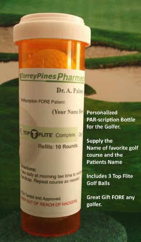 Parscriptions FORE patient (supply the name at check out) from the Torrey Pines Pharmacy (or your favorite golf course). Also includes 3 new golf balls, instructions and warnings of the product